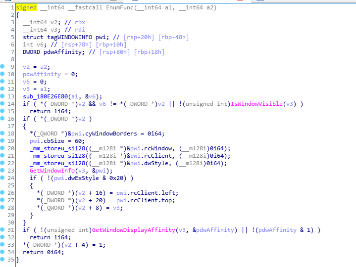 换个思路,NvStreamer应该不是真的截不到图,而只是为了跟从相关法规,拒绝截取相关内容。因此,NvStreamer应该要去判断当前桌面上是否存在被保护内容。如何判断呢?依然是Windows API:GetWindowDisplayAffinity.